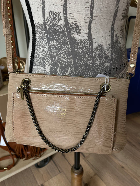 Pochette TROTT X en cuir irisé avec petite anse en chaîne Mila Louise. Dispo coloris opale