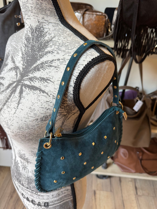 Sac format pochette Claire en daim et rivets (coloris bleu\vert)