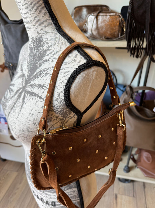 Sac format pochette Claire en daim et rivets - coloris cognac -