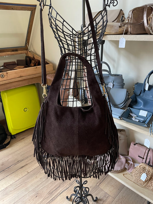 Sac Giulia en cuir suédé avec franges (coloris chocolat)