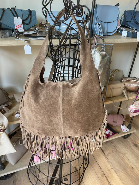 Sac Giulia en cuir suédé et franges (coloris taupe)