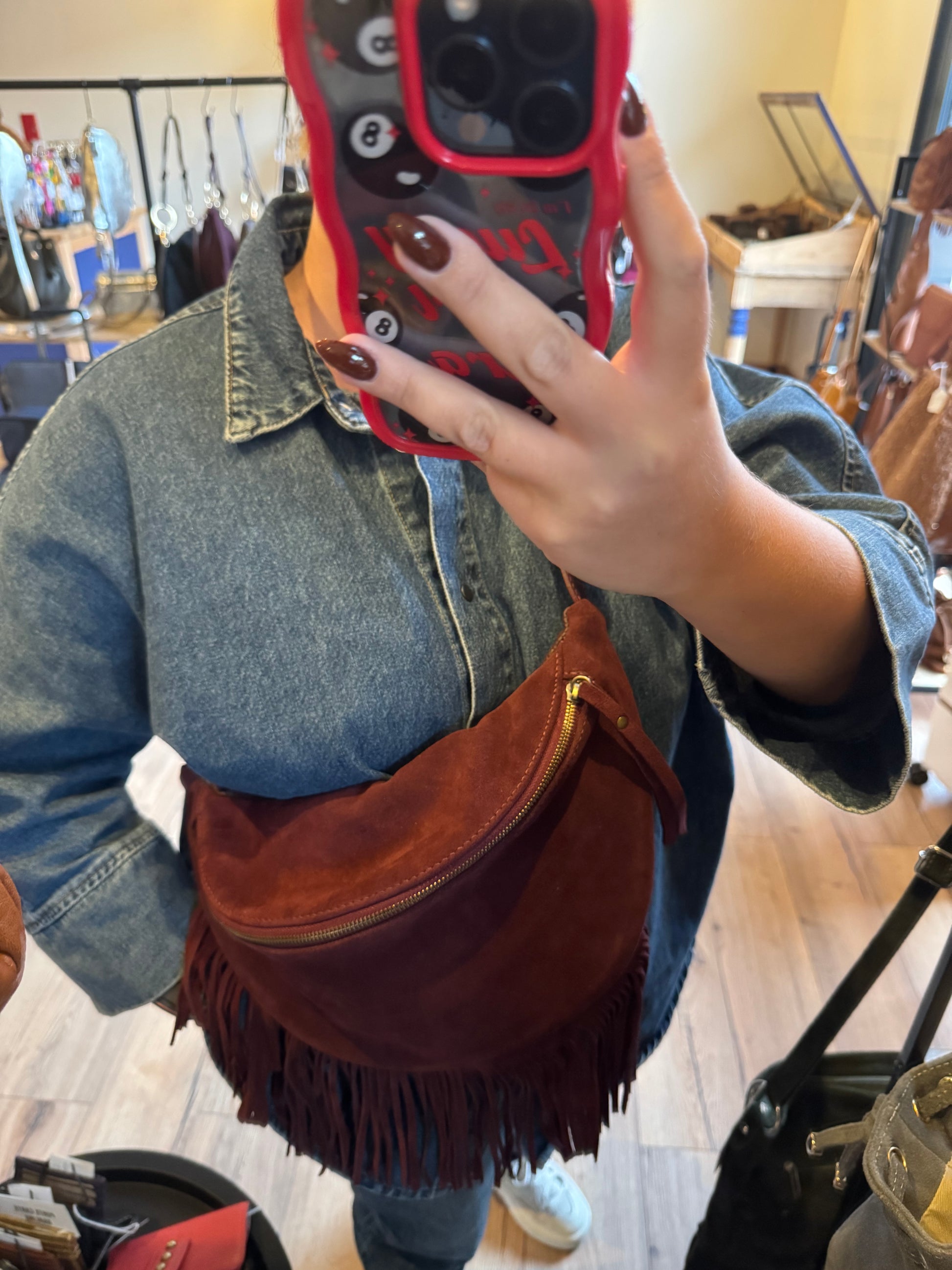 Banane Happy en daim et cuir avec franges coloris bordeaux