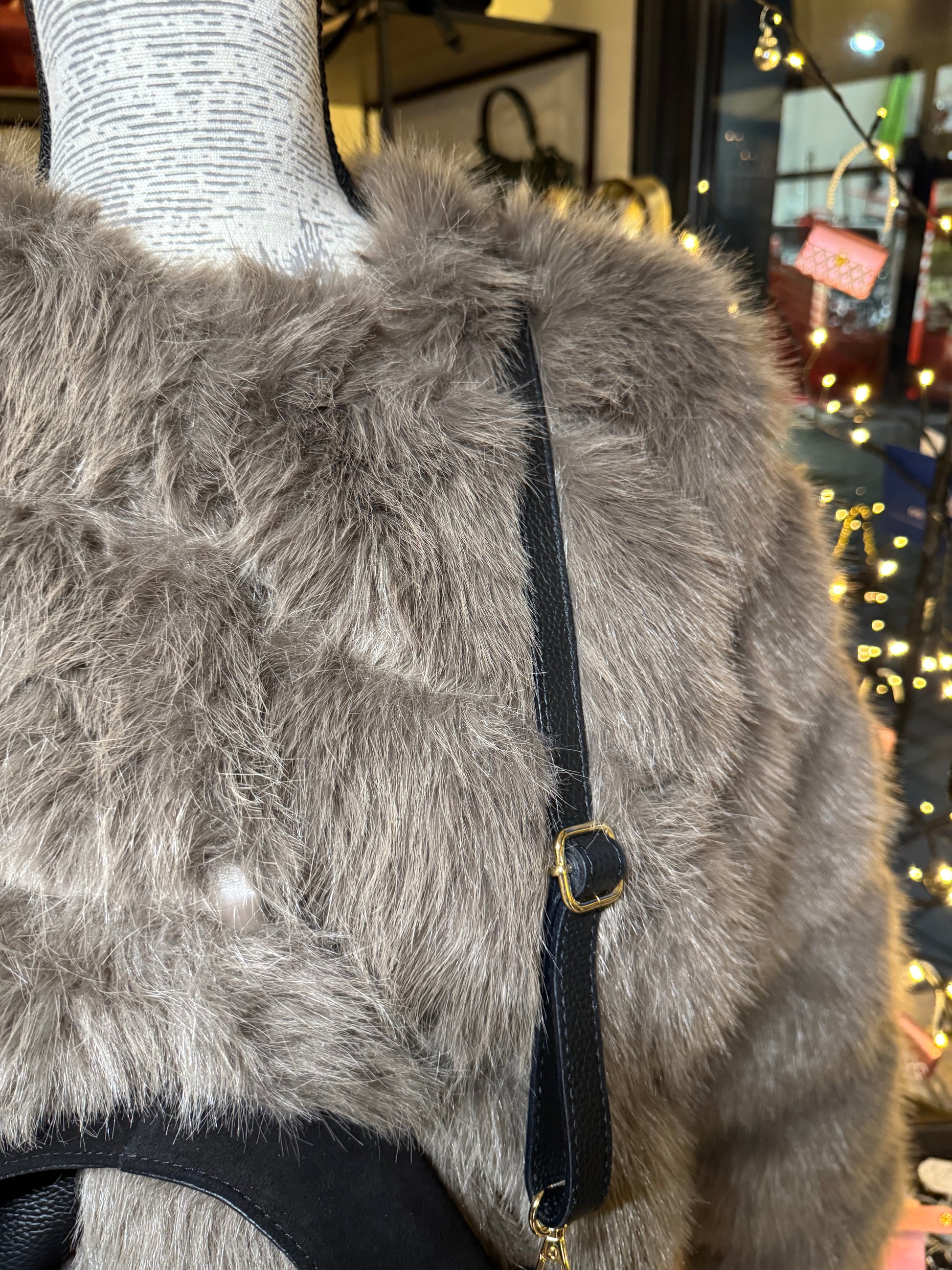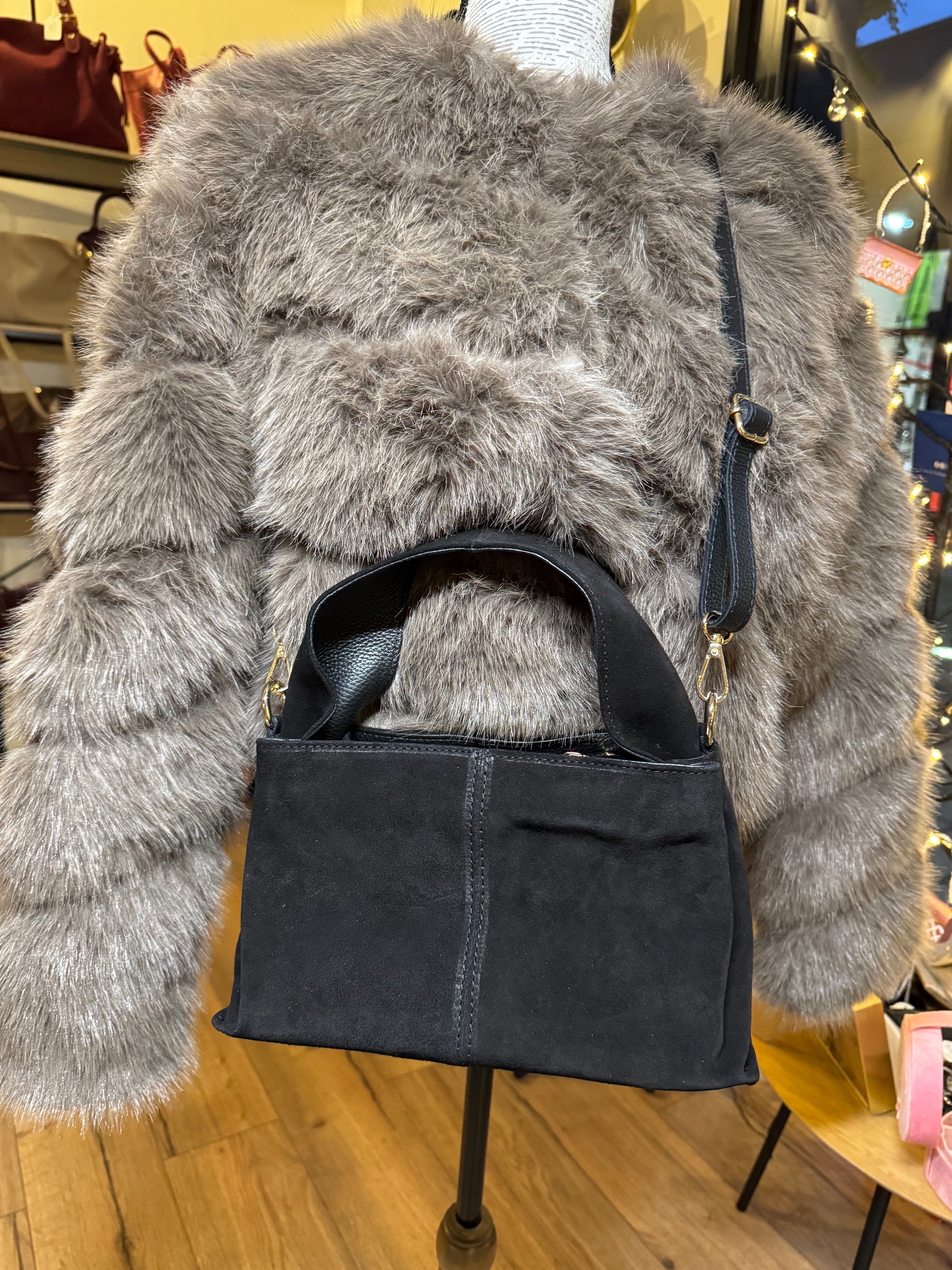 Petit sac en daim avec bandoulière amovible et réglable (max 109 cm avec les mousquetons)